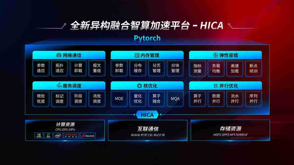 通过自研的服务层、、、、中间适配层、、、、以及调度编排算法,,,,采用数据并行、、模型并行等多种并行方式,,,把并行计算任务进行有效的分解,,,使其分别由相应的软件栈和算力资源来承接。。。。当GPU资源变化,,,,HICA可以实时动态调度计算子任务并调整模型拓扑和架构,,,以充分聚合各种算力资源。。