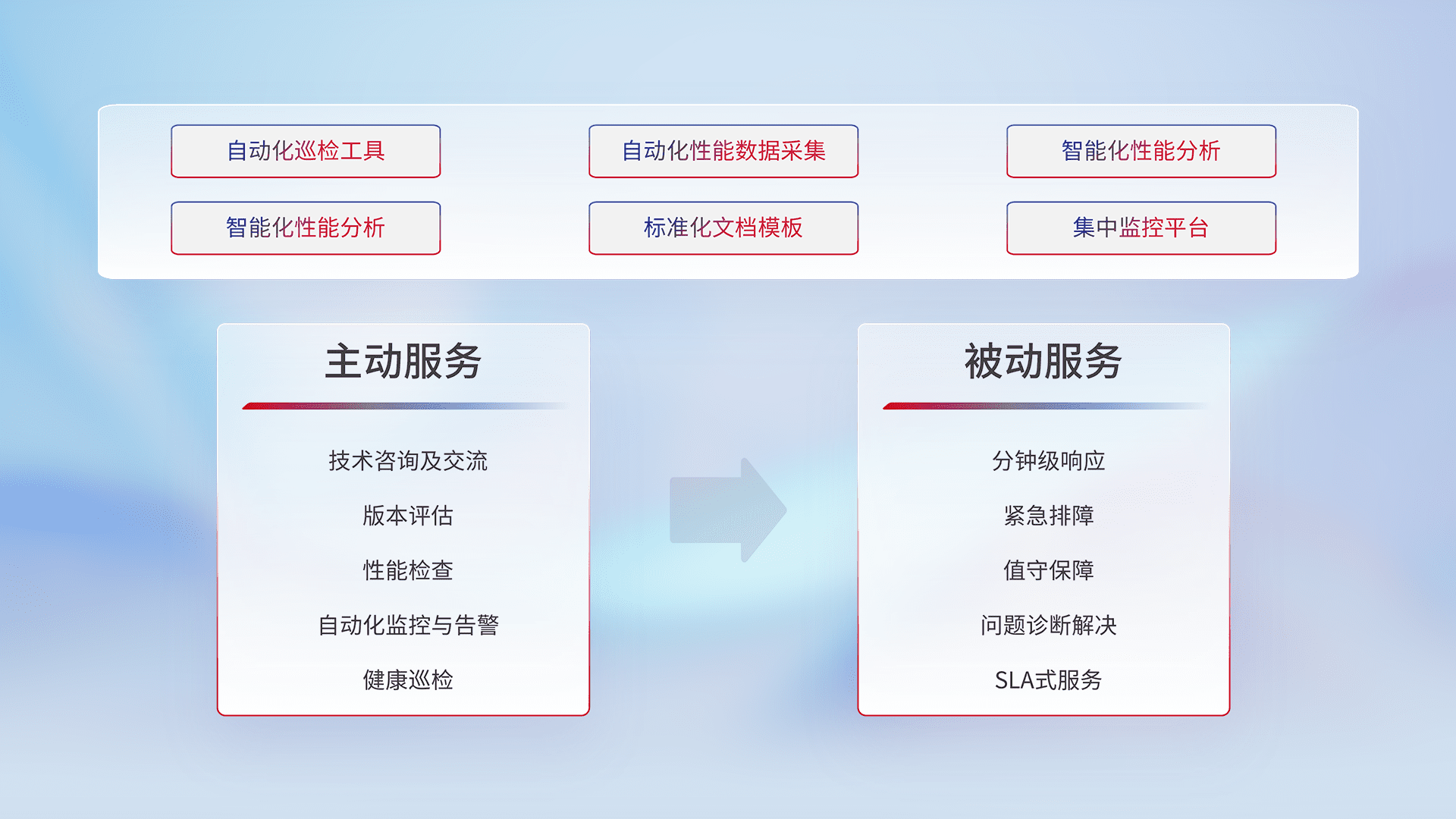 智能化工具和标准化文档,,,,保障服务质量,,提供主动服务(包含技术咨询、、、、版本评估、、、、性能检查、、、自动化监控与告警、、、、健康巡检)和被动服务包含(分钟级响应、、、、紧急排障、、值守保障、、、问题诊断解决、、、SLA服务)。。。