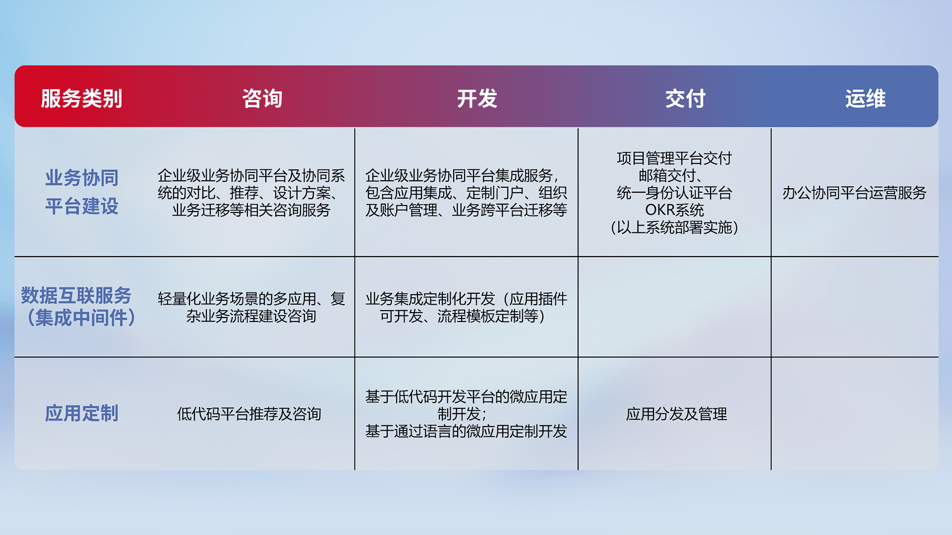 针对钉钉、、、企微、、、IDaas等平台级产品提供产品的规划、、方案、、、、交付、、定制化开发等服务,,,,实现如统一协同办公、、智能客户服务、、混合会议管理、、、智能数据查询、、等业务场景,,,实现数字化转型。。。。